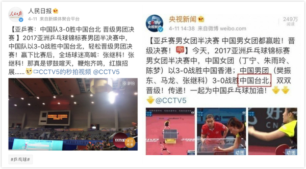 关键词:央媒 中国台北 亚洲乒乓球赛
