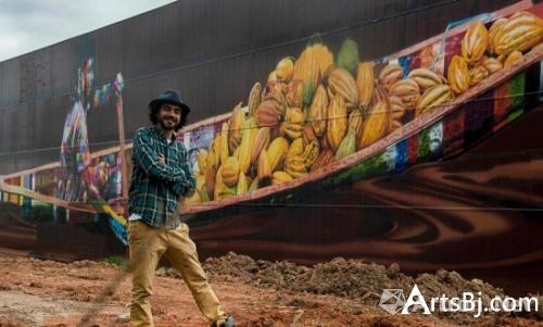 此次的壁画,科布拉以巧克力的原材料可可为题材?;?,一名男子在“巧克力河”上划着小船,船上满载着可可果实。
