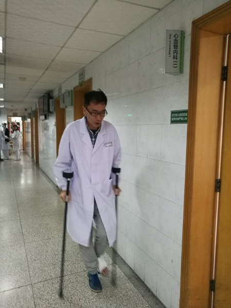 到了4月6日,他觉得脚疼得实在厉害,才去拍片,结果出来是骨折。由于医疗排班早已确定,王宇4月份都被安排在普通门诊,科室人手紧张,虽然已经骨折多日,王宇仍坚持上班。