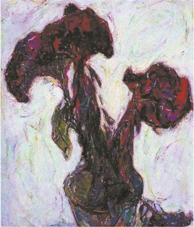 鸡冠花,开在花卉顶端,多为殷红色,肉质穗状花序呈扁平状,似公鸡“鸡冠”。这幅《鸡冠花》油画中的鸡冠花,三几簇腰肢肥瘦不一相托的花茎,头顶硕大嫣红的花冠,两簇应时昂扬开放,一簇应季华芳初败,一支纤弱应生凋折、花穗垂泥。罗尔纯先生形式感极强的构图,以恣意层叠复凝重的一道道笔触,一抹抹色彩,描绘出了一幅败而不枯、热情温润的《鸡冠花》盆景姿容。这幅画不仅体现了他敏锐的观察力和艺术智慧,也表达了他宽容、豁达、达观自然的生命理念和气度。恰如詹建俊所言,作品能最本质地反映一个画家的状态,艺术家在画里面体现出来的精神才是最真实的。罗先生的作品“有主见”“睿智”,符合罗先生“真正的性格、修养与作风”。