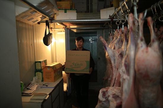 马成海将准备发货的羊肉打包成箱。新华社记者辛悦卫摄