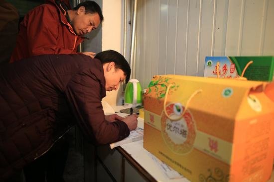 马成海在填写当天发货的快递单。新华社记者辛悦卫摄