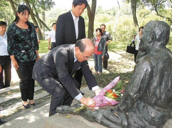 图为台南市长赖清德在2011年陪同日本官员参拜八田与一铜像。(来源:台湾联合新闻网)