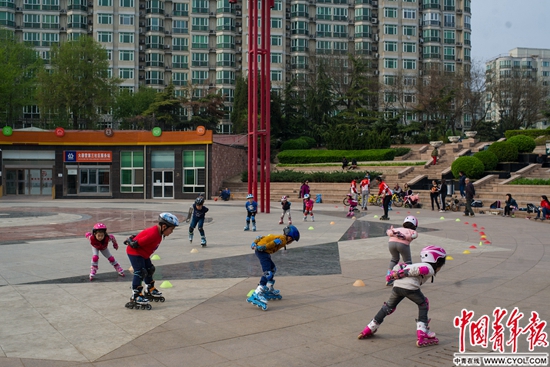 4月9日,北京市海淀区,靠近人大附小的观山园小区广场,孩子们在家长的带领下学习轮滑。该小区每平方米成交价格超过10万元。