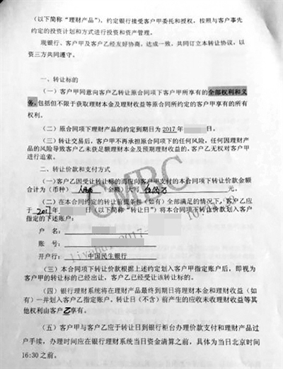 投资者签订的“理财产品”转让协议,合同上显示为民生银行理财产品。