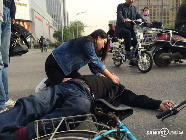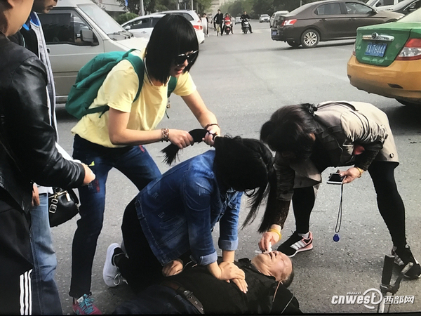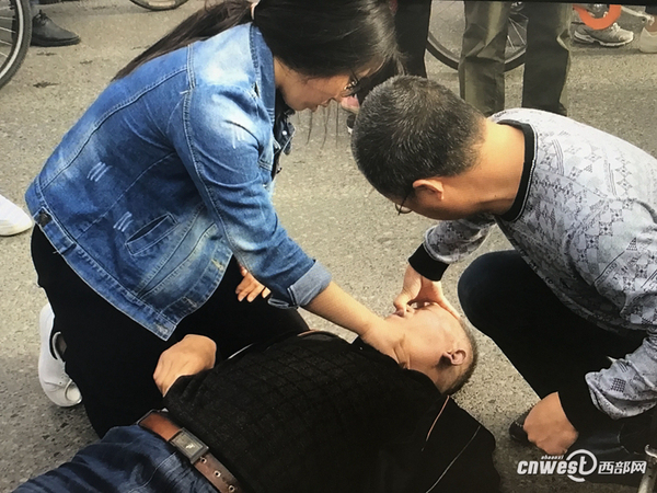 西安市民瑚先生:“等我再过来的时候,已经有一个女孩已经趴在(地)上面做开人工呼吸了,我被这个女孩感动了,因为这个老人可能六七十岁,嘴边留着白沫,那女孩直接用嘴把它吸出来、吐出来?!?/p>