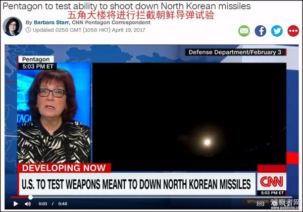 此外,据美国有线电视新闻网(CNN)19日报道,美军将于五月份进行2次拦截朝鲜导弹试验。美军在太平洋海域进行的长期导弹防御项目测试,据美国国防官员称,目的是应对来自朝鲜或伊朗的导弹威胁。