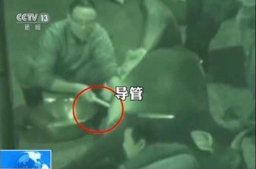 几分钟之后,这头牛显得安静了不少,随后上演的残忍一幕,让现场调查员触目惊心。几分钟之后,一个戴眼镜的男子,在牛肚子上割开了一个小口子,随后拿来一根导管刺入牛肚子进行放血
