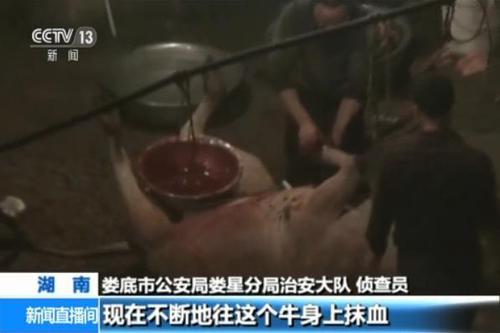 娄底市公安局娄星分局治安大队:用绳子拉着牛头,不让它动摇,现在这头牛还在不断地挣扎。