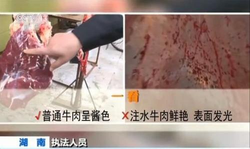 执法人员:从颜色上看,正常的牛肉,它是酱色。打了水的牛肉的话,它第一个颜色比较鲜艳,表面发光。用餐巾纸粘在牛肉的表面,它如果打了水的话,餐巾纸就一下子湿掉了。