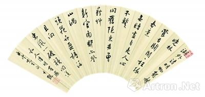 沈尹默行书扇面。行笔迅起急收,点画峻利,转折处多以侧锋取势形成内圆外方,撇捺重顿,结构疏密自然,纵横倚斜,错落有致。