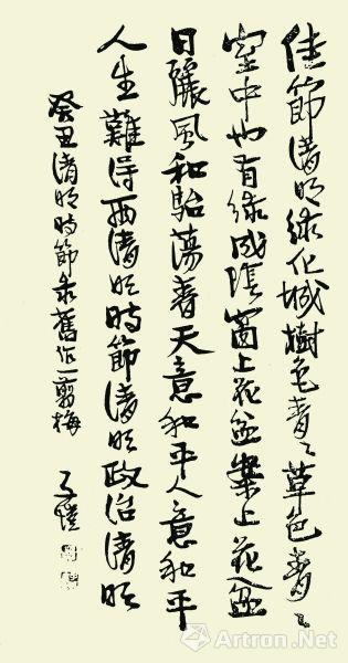 丰子恺行书中堂,纵85cm,横38cm。书法多以碑笔入书,参以章草和“二王”。丰子恺在装帧、美术、音乐、书法、文学、教育、翻译等领域都卓然大家。从这个意义上讲,他在同代文艺家中是绝无仅有的。因为这一点,他的书法意味是超越了点画和字形之外的,值得玩味。