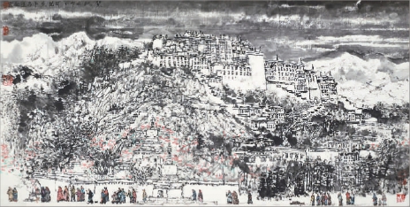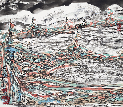 “水墨”是李小可艺术创作的主要语言方式,从“北京系列”起步发展到“水墨家园”再到“雪域藏迹”“山水黄山”系列,他不断地找寻着语言与笔墨之间的契合点,逐渐形成了自己独特的艺术表达风格。此次展览主要展出了李小可的“雪域藏迹”系列作品。李可染的山水画着重表现秀丽深邃、情致浓郁的江南水乡,李小可没有因循父亲的路子,而是另辟蹊径,选择了特殊的藏地题材。西藏特殊的自然、文化、意境以及特殊的精神性深深地触动了他,他说:“要表现西藏的特殊性,把自己内心的感觉画出来,是没有先例借鉴的,所以需要深入体验,要走在其中,从雪山显露出来的瑰丽和雄浑中感受它内在的‘魂’ 。 ”李小可的作品经常以“山魂”“远方”为题,在他眼中,喜马拉雅、苍茫雪域已不再是一种单纯的自然风景,而是人们对遥远和崇高的追溯。他是怀着敬畏之心,用无声的笔墨表达他对藏族聚居区文化和内在精神的理解,以及他对理想和远方的朝圣。无声的雪山,成群的玛尼堆,飞扬的五彩经幡,在他的表现下都饱含了深情。李可染过去常讲“可贵者胆,所要者魂” ,在李小可看来,“魂”的核心就是“情” ?!罢獯握估酪浴酱ㄏ绻椤魈猓褪撬瞪剿誓幸星楦?。艺术作品是对生活或是对人生经历的一种‘生之恋’情,因为有情,所以绘画语言表现出来的景色就具有了精神。我的‘雪域藏?!盗凶髌犯嗍潜硐肿约憾圆刈寰劬忧厥獾那榛?。 ”