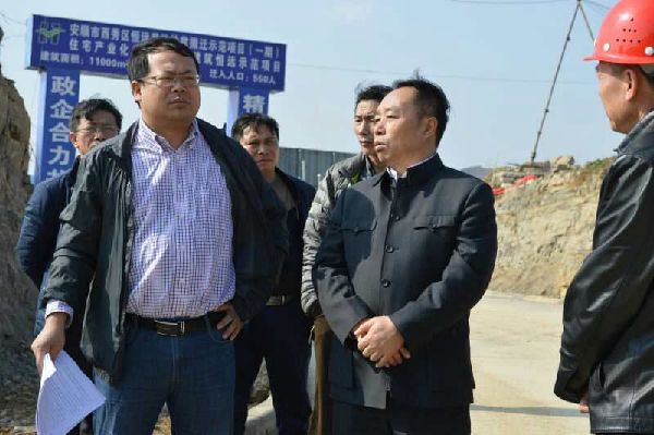 邓兴贵(前左二)陪同安顺市西秀区领导视察异地搬迁示范项目工地。