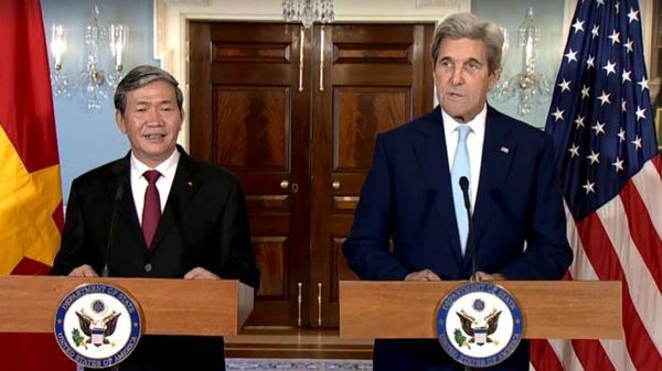 美国国务卿约翰·克里(右)与越共中央书记处常务书记丁世兄(左),两人在2016年10月25日会晤,克里声称美越将在南海共同“维护法治”。