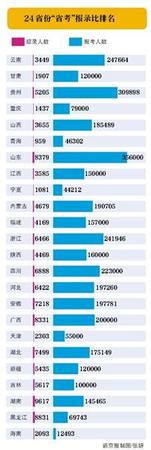 据北京华图教育相关统计,报名人数最多的前三省分别为山东、贵州和云南,其中山东省的报名人数达到35.6万人。从报考人数和招录人数的比值看,云南省平均1个职位有72人报考,竞争最为激烈。