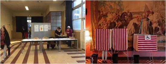 左图为新华社驻巴黎记者韩冰拍摄大选当天投票站点。右图为此前在纽约开设的法国大选海外投票站点。