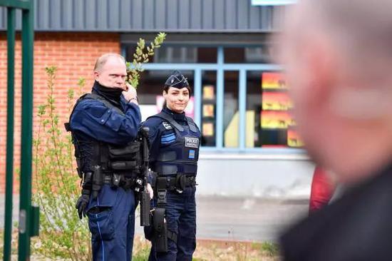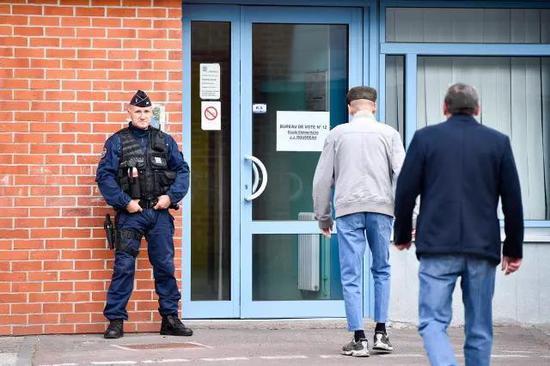 新华社驻巴黎记者陈益宸拍到,选民走入埃南-博蒙投票站进行投票,边上警察严阵以待