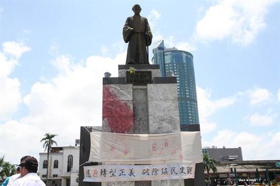 位于台南的郑成功铜像曾遭人泼红墨水破坏(图片来源:"中时电子报")