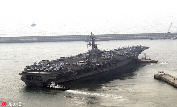 当地时间2017年4月9日,据媒体报道,美国海军卡尔-文森号航母战斗群正驶向临近朝鲜半岛的西太平洋,以威慑朝鲜。 美军官方人士称,卡尔-文森号航母的此次行动是对近日朝鲜一系列挑衅行动的回应。 卡尔-文森号航母隶属美国第三舰队,排水量超过10万吨,可以搭载F-18超级大黄蜂战机, E-2“鹰眼”预警机。