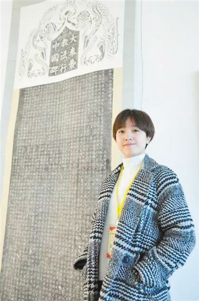 李韵和她颖拓的景教碑碑头。资料图片
