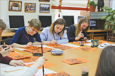 俄罗斯喀山联邦大学孔子学院的学生正在练习中国书法