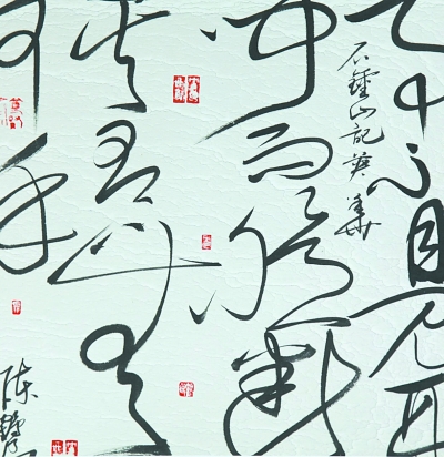 神形兼备,是“无边书法”的第三大特色。书法作品的内容,无论短字长句,均取自中国传世经典,形成对书法作品的厚重文化支撑,让观者在欣赏书法形式美的同时,深深浸润在中华文化博大精深的智慧中。书画相映,是“无边书法”的第四大特色。秉承中国传统“书画同源”的理念,一幅酣畅流利、黑白相间的作品,往往书画共存。有时,画是映衬底色,书法登堂彰显,画的浅绿底色衬托出字的黑白?;蛉皇榛采?,不分彼此,浑然一体,横看如草书侧观似水墨。陈鹤良先生还大胆尝试引进红色,巧妙恰当地使用红色印章,让红色不规则地点缀在黑字白纸间,使书法平添出几分暖色,作品更是生动明亮起来。