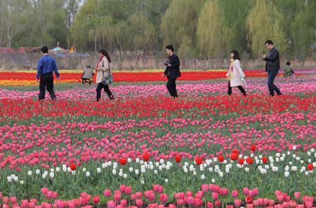 4月27日,距离新疆首府乌鲁木齐市30多公里的军垦新城新疆五家渠市第十二届郁金香节在青格达湖旅游风景区开幕,130多个品种的近200万株郁金香绚丽绽放,迎接八方游客的到来。据悉,五家渠是目前新疆规模最大、品种最多、花色最丰富的郁金香种植观赏区。