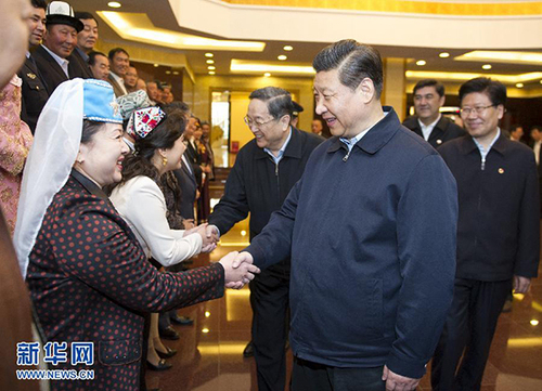 2014年4月30日上午,正在新疆考察工作的中共中央总书记、国家主席、中央军委主席习近平在乌鲁木齐接见劳动模范和先进工作者、先进人物代表,并同他们座谈。这是习近平与劳动模范和先进工作者、先进人物代表亲切握手。新华社记者 谢环驰 摄