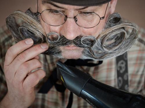 为了给胡子打造最佳造型,参赛者们各出奇招,除了使用吹风机,还会用到发蜡和发油。 美髯公们对镜整理各自的胡子同时,也不忘互相帮助,绅士风度十足。