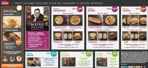 这些餐点的价格在法国国营铁路公司网站上一目了然:一份简易套餐(三明治+酸奶/薯条+矿泉水/可乐)为8.5欧元(1欧元合7.5元人民币),相对丰盛些的美味套餐(土豆炖牛肉/蘑菇芦笋意面+自选甜点+自选饮品)为13.9欧,由名厨烹制的星级套餐则售价17欧。