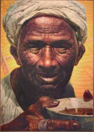 上世纪八十年代上大学的时候,曾看过罗中立的成名作《父亲》,其震撼至今留在心间:黝黑的满布沟壑的脸,透着希冀深陷的眼窝,干裂的微张的口唇,还有位于画面最前方捧着粗瓷碗的那张粗糙、裹着厚厚的老茧的手……典型的中国农民的脸和劳动人民的手??!