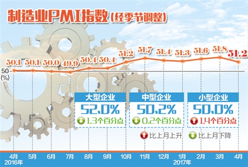 “尽管PMI有所回落,但同时也要看到一些积极因素仍在不断积累?!闭郧旌又赋?4月份,装备制造业和高技术制造业PMI为52.1%和53.4%,分别高于制造业总体水平0.9个和2.2个百分点,装备制造业和高技术制造业在推动制造业转型升级中继续发挥引领作用。消费品制造业PMI为52.2%,比上月微升0.1个百分点。其中,农副食品加工业、食品及酒饮料精制茶制造业、医药制造业等行业保持稳步增长。这表明消费品制造业对稳定经济增长作用不断增强。