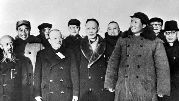 1949年3月25日,毛泽东主席等率中共中央机关和人民解放军总部进入北平。这是同前来迎接的民主党派负责人和其他民主人士在西苑机场合影。左起:沈钧儒、朱德、董必武、李济深、陈其瑗、郭沫若、黄炎培、毛泽东、林伯渠、马叙伦