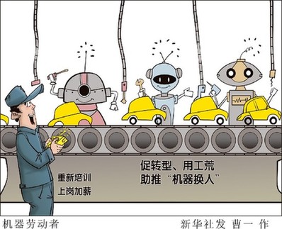 新闻:“五一”节,劳动者的节日。与此同时,一种“机器人劳动者”正日益引发社会关注。工信部官网显示:浙江率先推进“机器换人”,计划自2013年起5年间,每年实施5000个“机器换人”项目,实现5000亿元“机器换人”投资。浙江省经信委副主任凌云称该项目至2015年已累计减少普通劳动工人近200万人;安徽正抓紧推进“‘机器换人’十百千工程”;广东、山东等地则都在自身具备比较优势的产业领域大力推动“机器换人”,已有不少人工岗位被机器人劳动力替代。(新闻来源:新华社)