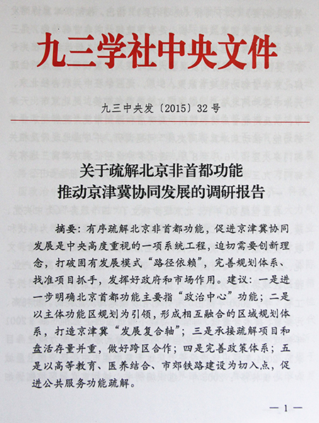 关键词:九三学社 建言 疏解 非首都功能 京津冀