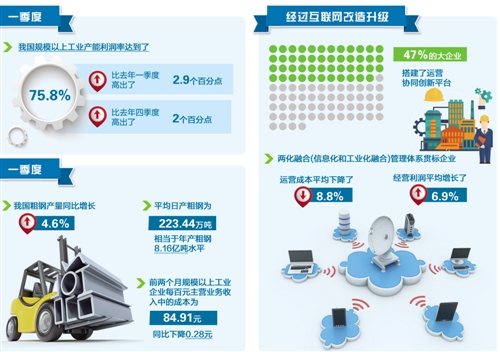 最新发布的工业通信业发展数据显示,一季度我国规模以上工业产能利润率达到了75.8%,比去年一季度和四季度分别高出了2.9个和2个百分点。钢铁行业在去年退出6500万吨以上产能的基础上,今年一季度粗钢产量同比增长了4.6%,产能利用率达到了73.7%,比去年四季度产能利用率提高了0.7个百分点。