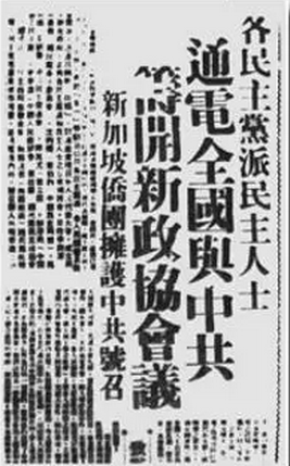 1948年4月30日,中共中央发布纪念“五一”劳动节口号,其中第五条提出“各民主党派、各人民团体及社会贤达,迅速召开政治协商会议,讨论并实现召集人民代表大会,成立民主联合政府”。