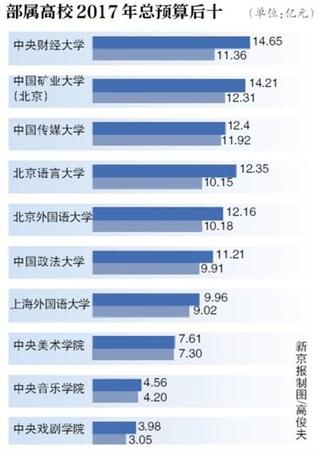 预算最少的后三位是中央美术学院、中央音乐学院和中央戏剧学院,均为艺术类院校,预算总额均未超10亿元。