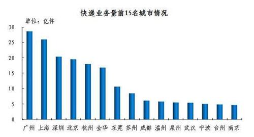 快递业务量排名前十五位的城市依次是广州、上海、深圳、北京、杭州、金华(义乌)、东莞、苏州、成都、温州、泉州、武汉、宁波、台州和南京,其快递业务量合计占全部快递业务量的比重达到59.7%。