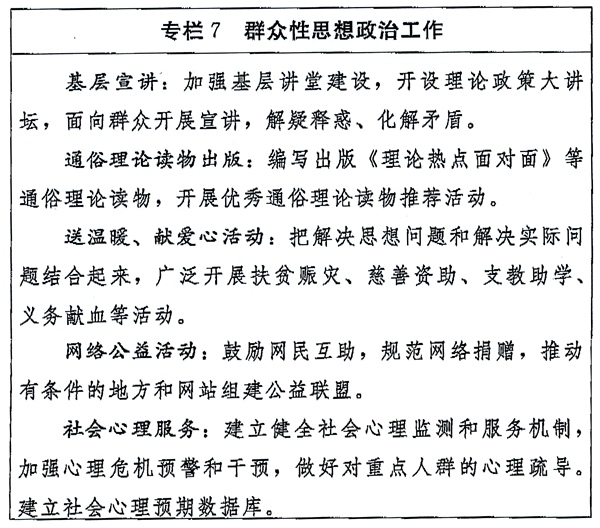 (二)加强和改进群众性思想政治工作。加强对社会热点难点问题的应对解读,合理引导社会预期,组织开展理论宣讲和形势政策教育,设计有特色有实效的活动载体。推动基层党组织、基层单位、城乡社区有针对性地加强思想政治工作,创新新经济组织和新社会组织的思想政治工作方式。加强青少年思想政治工作。加强高校思想政治建设。持续深入推进“基层工作加强年”活动。健全人文关怀和心理疏导机制,培育自尊自信、理性平和、积极向上的社会心态。