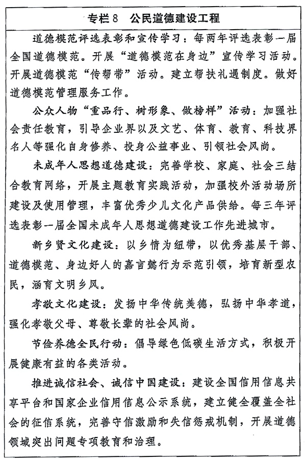 (三)深入推进公民道德建设。加强社会公德、职业道德、家庭美德、个人品德教育。发挥党员干部的模范带头作用。举办中国公民道德论坛。礼敬英雄人物,加强对全国重大典型和道德模范、时代楷模的学习宣传,广泛推出“最美人物”、善行义举和身边好人。建立健全先进模范发挥作用的长效机制。弘扬中华传统美德,创新发展乡贤文化,开展孝敬教育、勤劳节俭教育、文明礼仪教育。加强社会诚信建设,推进诚信建设制度化。弘扬劳动最光荣、劳动者最伟大的观念,加强企业文化建设,培育创新创业精神。