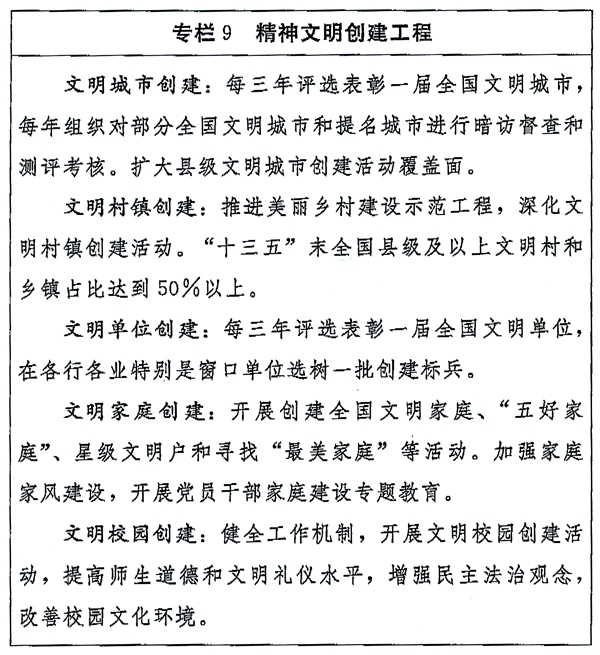 (四)深化拓展群众性精神文明创建活动。广泛开展群众性精神文明创建活动,修订完善各类创建测评体系。加强和改进文明城市创建管理,培育城市精神。加强农村精神文明建设。加强文明行业文明单位创建。培育优良家风家教,传承优良校风校训。针对群众反映强烈的突出问题,开展专项文明行动。完善文化科技卫生“三下乡”长效机制。倡导文明健康生活方式。制定国家礼仪规程。实施全民文明礼仪教育养成行动,培育文明行为习惯。规范升国旗仪式、成人仪式、入党入团入队仪式等礼仪制度。广泛开展军民警民共建精神文明活动。落实党和国家有关政策规定,加强对各类评比活动的规范管理。