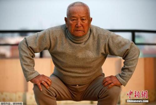 当地时间4月12日,尼泊尔加德满都,85岁的登山爱好者敏·巴哈杜尔·谢尔占练习瑜伽,为攀登世界最高峰珠穆朗玛峰作准备。