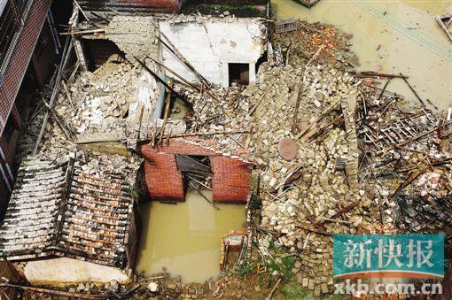 昨日下午,广州市花都区花山镇洛场村,倒塌在水中的老房子。摄影 宁彪 孙毅