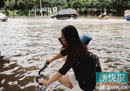 暴雨过后,白云区金沙洲彩滨北路段水淹严重,行人骑车小心而走。摄影 宁彪 孙毅