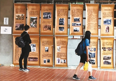 4月24日,台中市。东海大学社会科学院中庭广场挂了近百幅图文,这是“反殖民与台湾光复——日据时期历史图文展”的第十五站。
