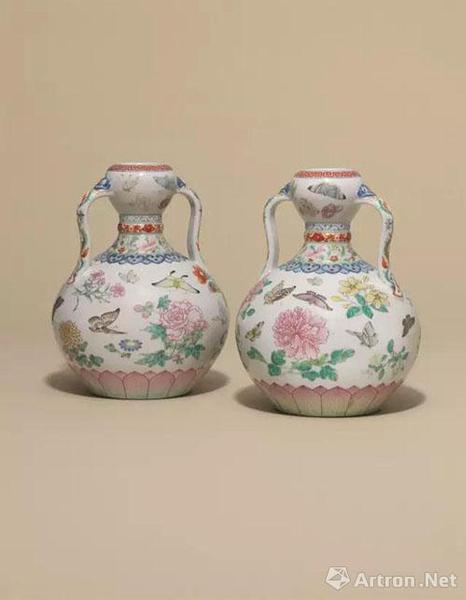 一对珍罕乾隆御制粉彩花蝶纹如意耳葫芦尊现佳士得伦敦