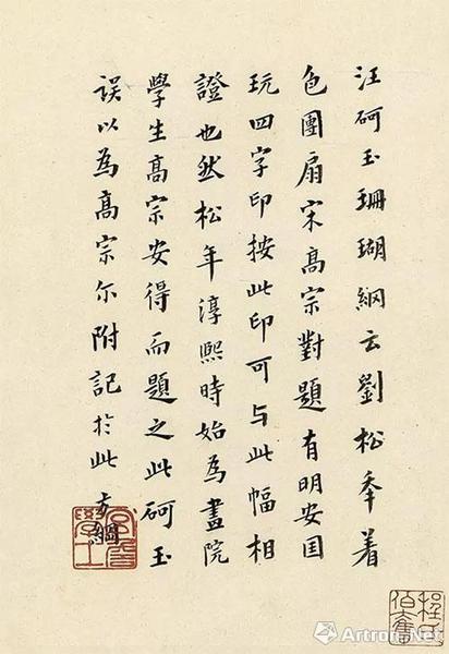 题跋:翁方纲题跋:汪砢玉《珊瑚网》云:“刘松年着色团扇,宋高宗对题,有‘明安国玩’四字印?!卑从】捎氪朔嘀ひ?。然松年淳熙时始为画院学生,高宗安得题之。此砢玉误以为高宗尔。附寄于此。方纲。