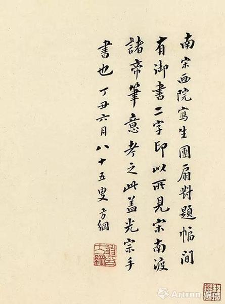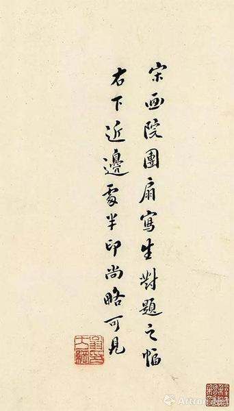 题跋:翁方纲题跋:南宋画院写生团扇对题幅,间有“御书”二字印。以所见宋南渡诸帝笔意考之,此盖光宗手书也。丁丑(1817年)六月,八十五叟方纲。